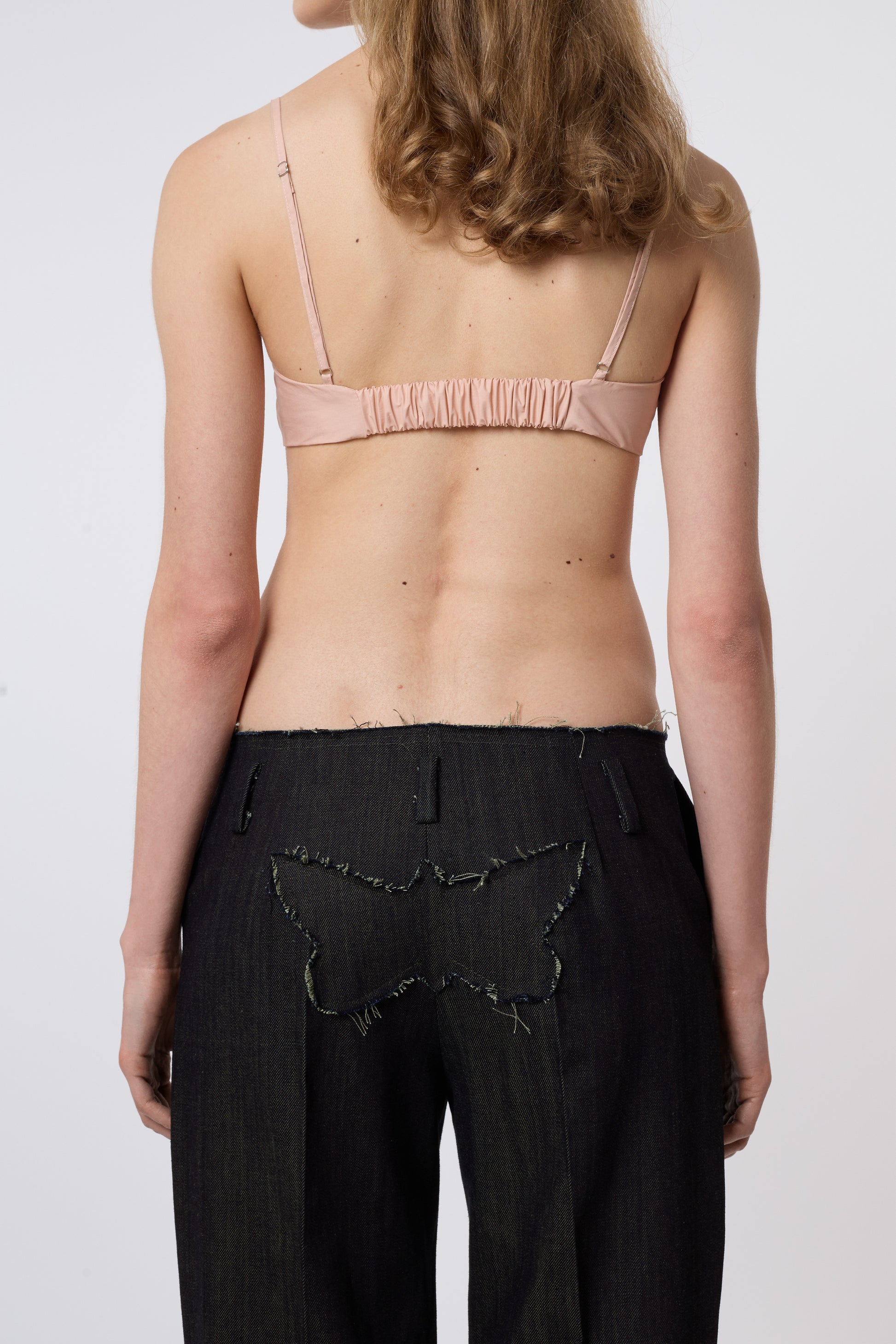 Made from deadstock cotton denim, the Butterfly trousers take inspiration from classic men’s tailoring while reinterpreting it with an irreverent twist. They feature a low-rise waist and raw-cut finishes, while a butterfly-shaped patch on the back adds a playful edge, making them a bold everyday statement. Details such as the front zipper closure, side pockets and belt loops reflect the values of Italian savoir-faire.