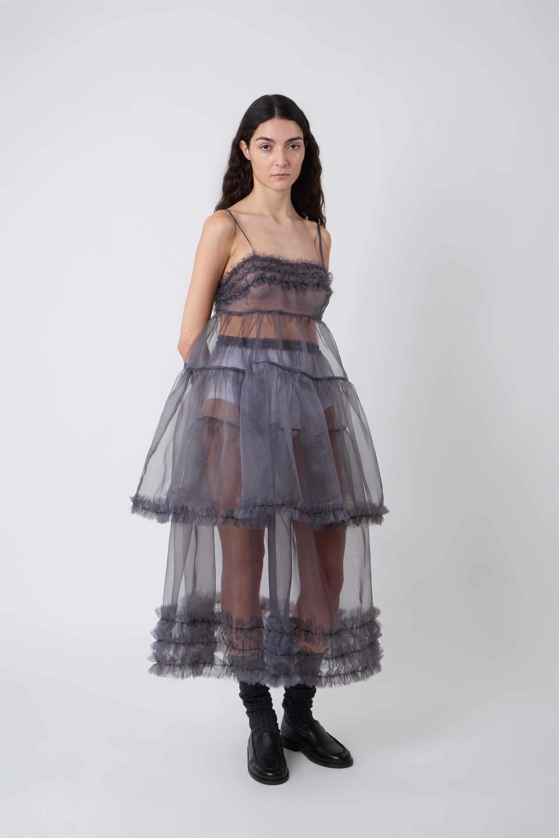 With a romantic soul, the Eloise dress is made of precious leftover fabric. Thin straps wrap the shoulders and close with two delicate bows at the back. The minimalist silhouette of the bodice is enriched by romantic rouches. Underneath a voluminous skirt that falls above either the ankle or the knee. The edges are refined with sophisticated ruches. The Eloise dress simultaneously evokes essentiality and everyday romanticism.