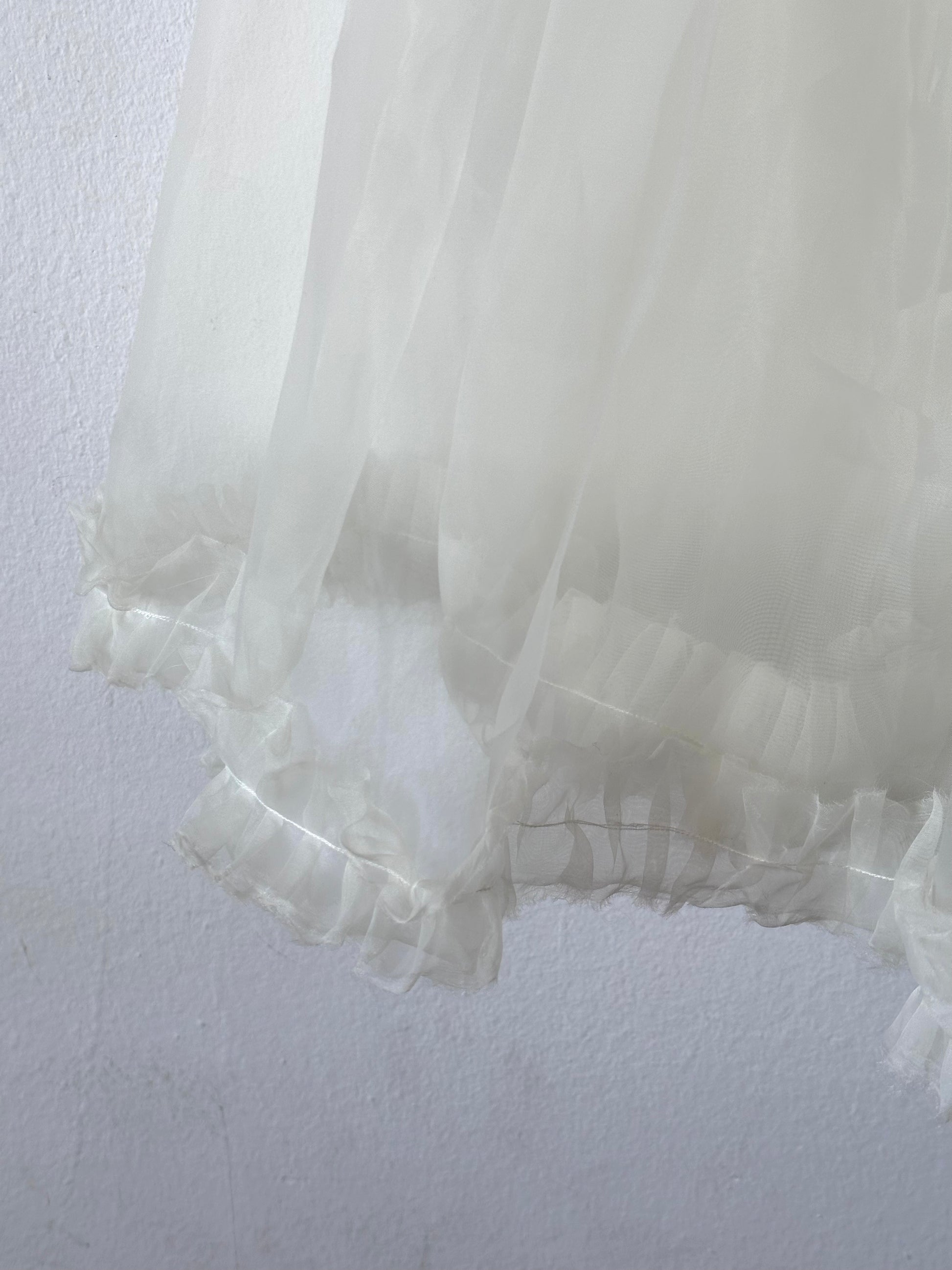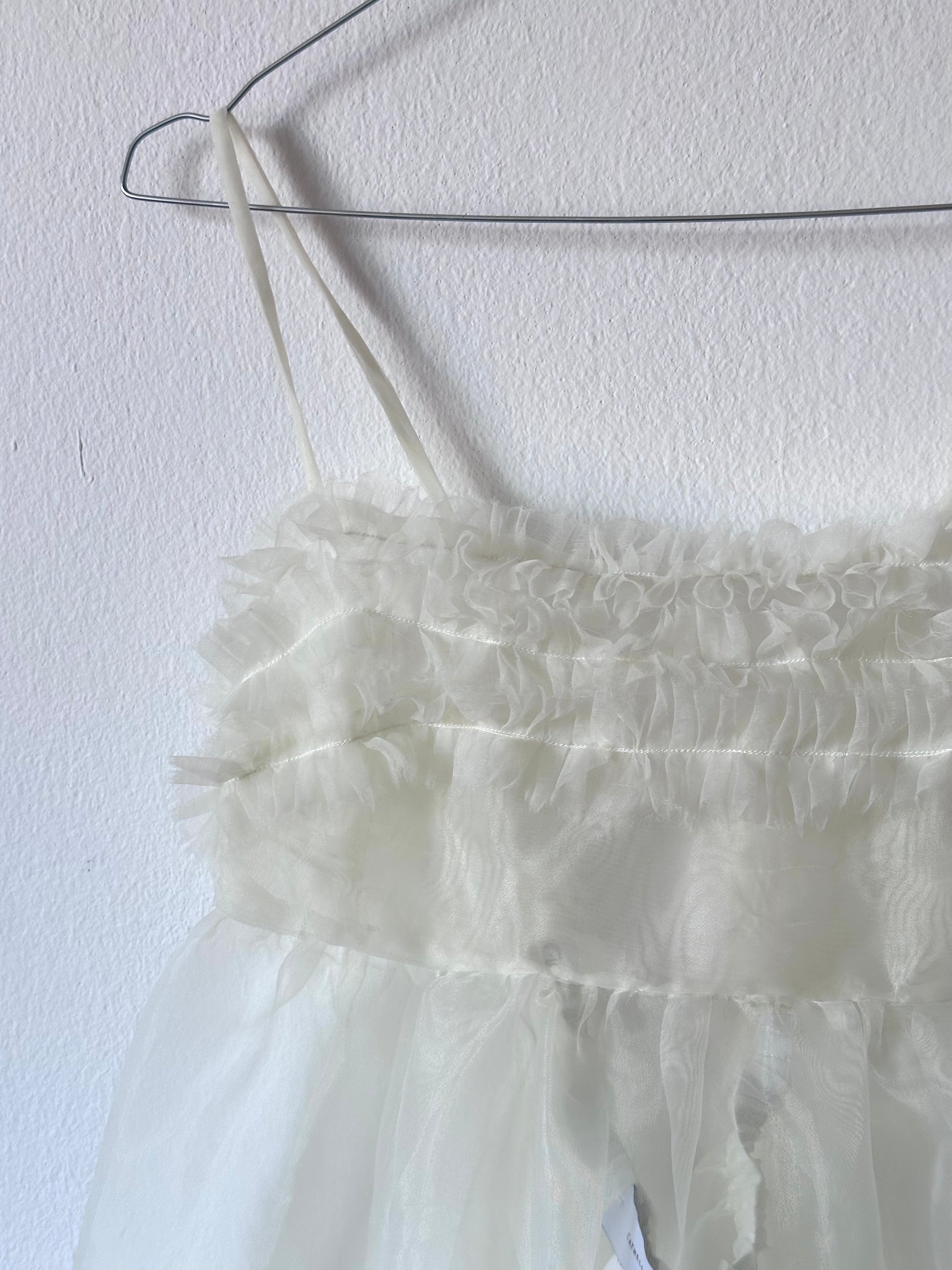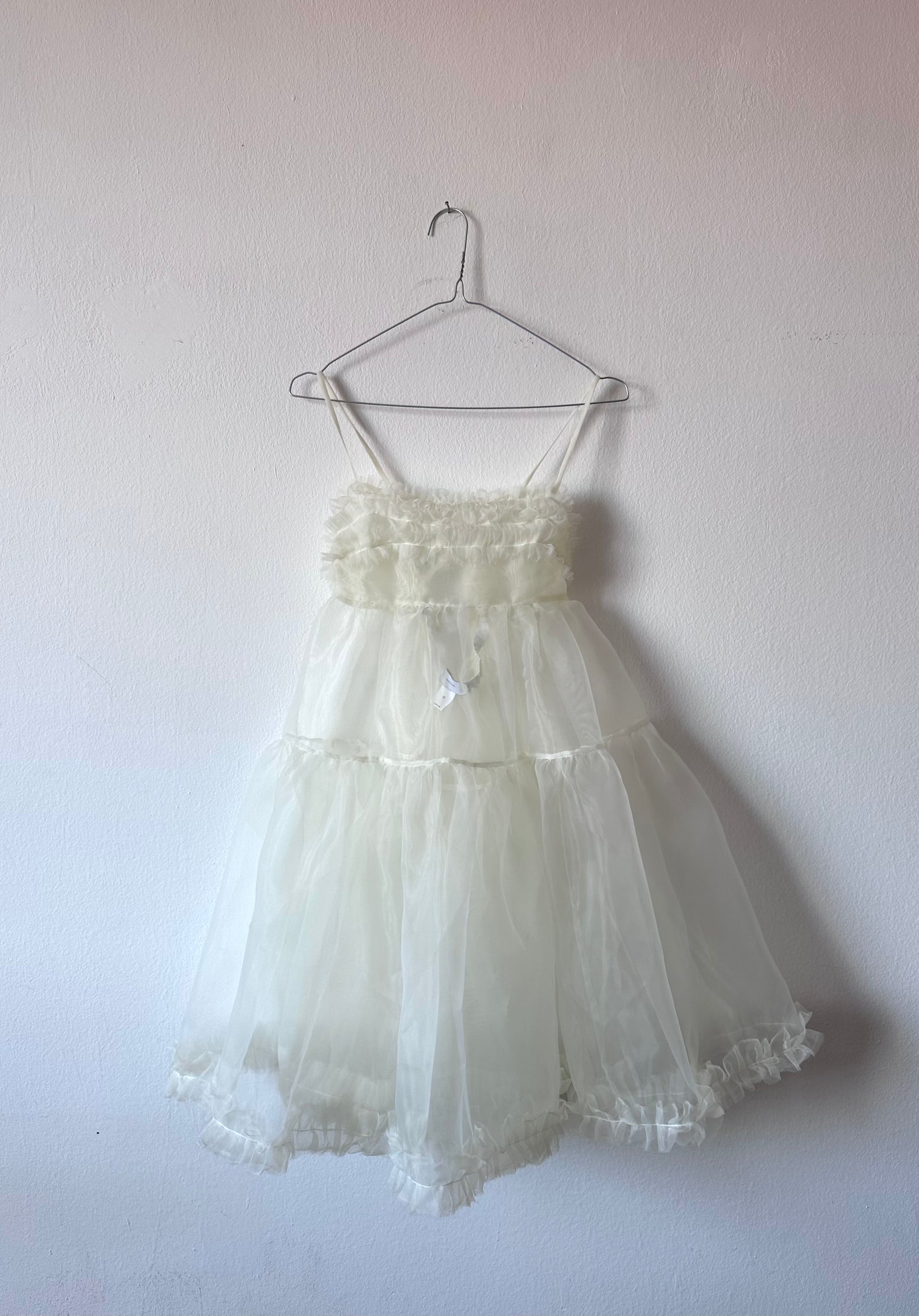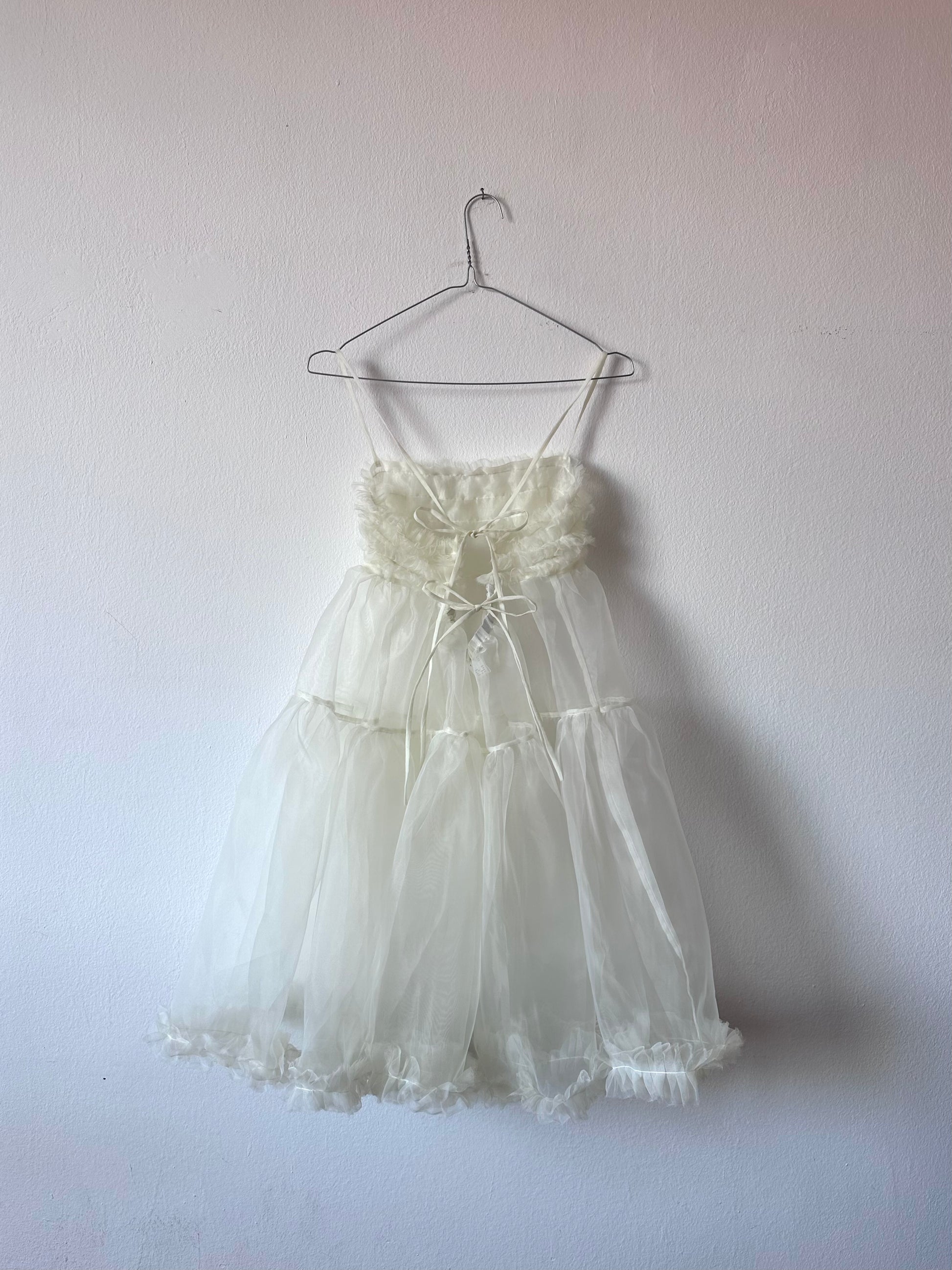 With a romantic soul, the Eloise dress is made of precious leftover fabric. Thin straps wrap the shoulders and close with two delicate bows at the back. The minimalist silhouette of the bodice is enriched by romantic rouches. Underneath a voluminous skirt that falls above either the ankle or the knee. The edges are refined with sophisticated ruches. The Eloise dress simultaneously evokes essentiality and everyday romanticism.