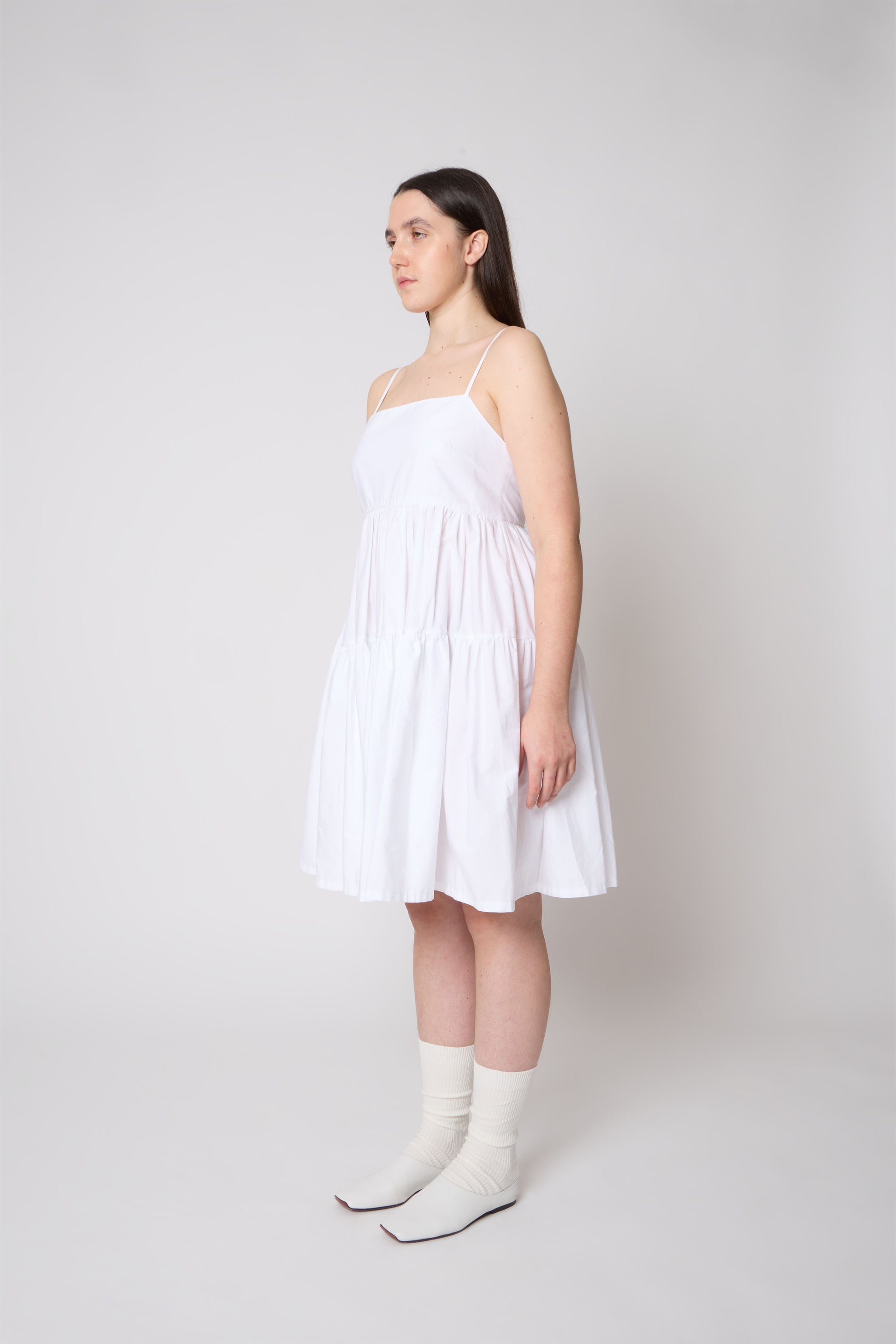 With a romantic soul, the Eloise dress is made of precious leftover fabric. Thin straps wrap the shoulders and close with two delicate bows at the back. The minimalist silhouette of the bodice balances a voluminous skirt that falls above either the ankle or the knee. The Eloise dress simultaneously evokes essentiality and everyday romanticism.
