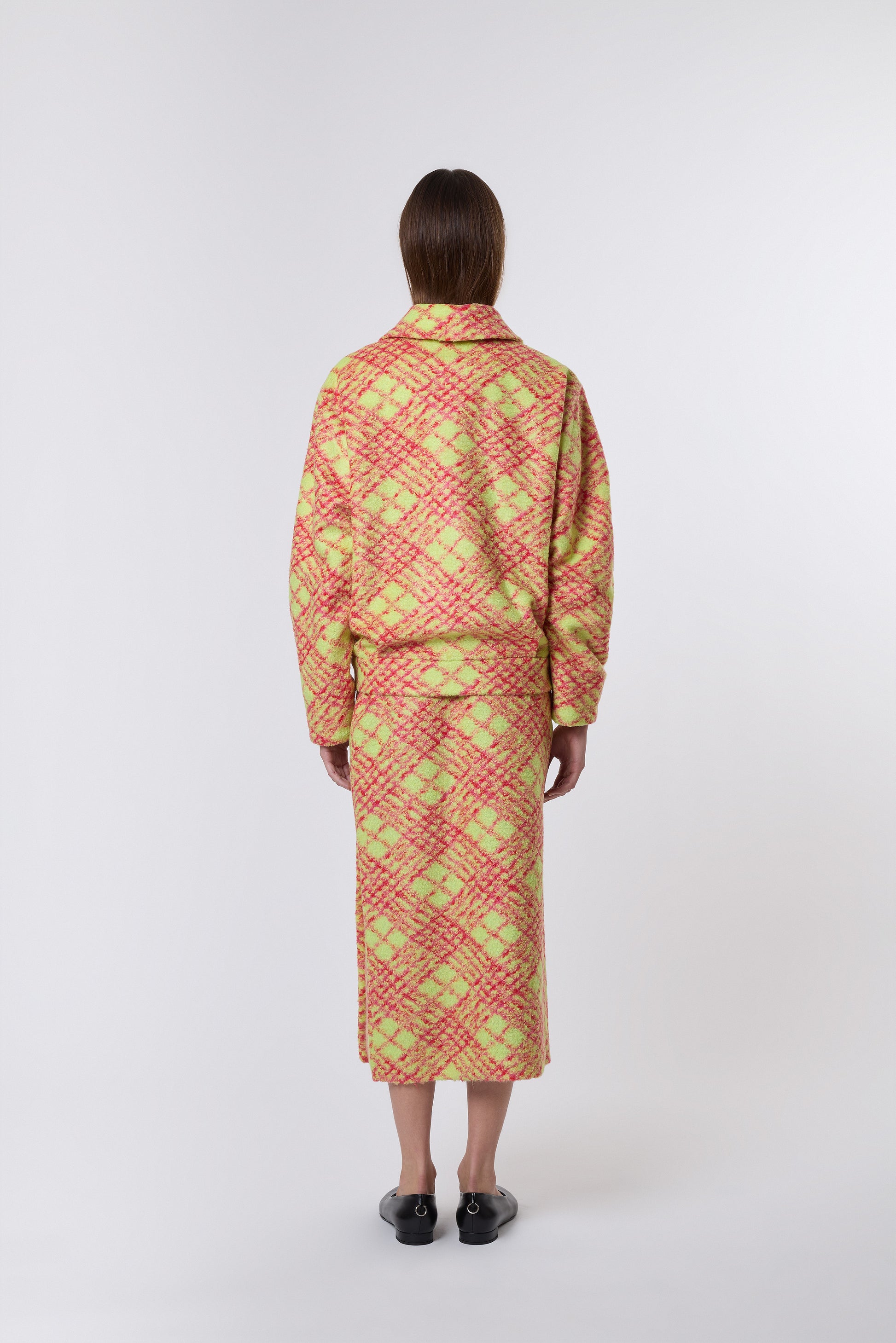 Its boxy silhouette sits on the hips, creating a bouncy effect. It features a pointed collar that can be worn down or closed with a hidden button.