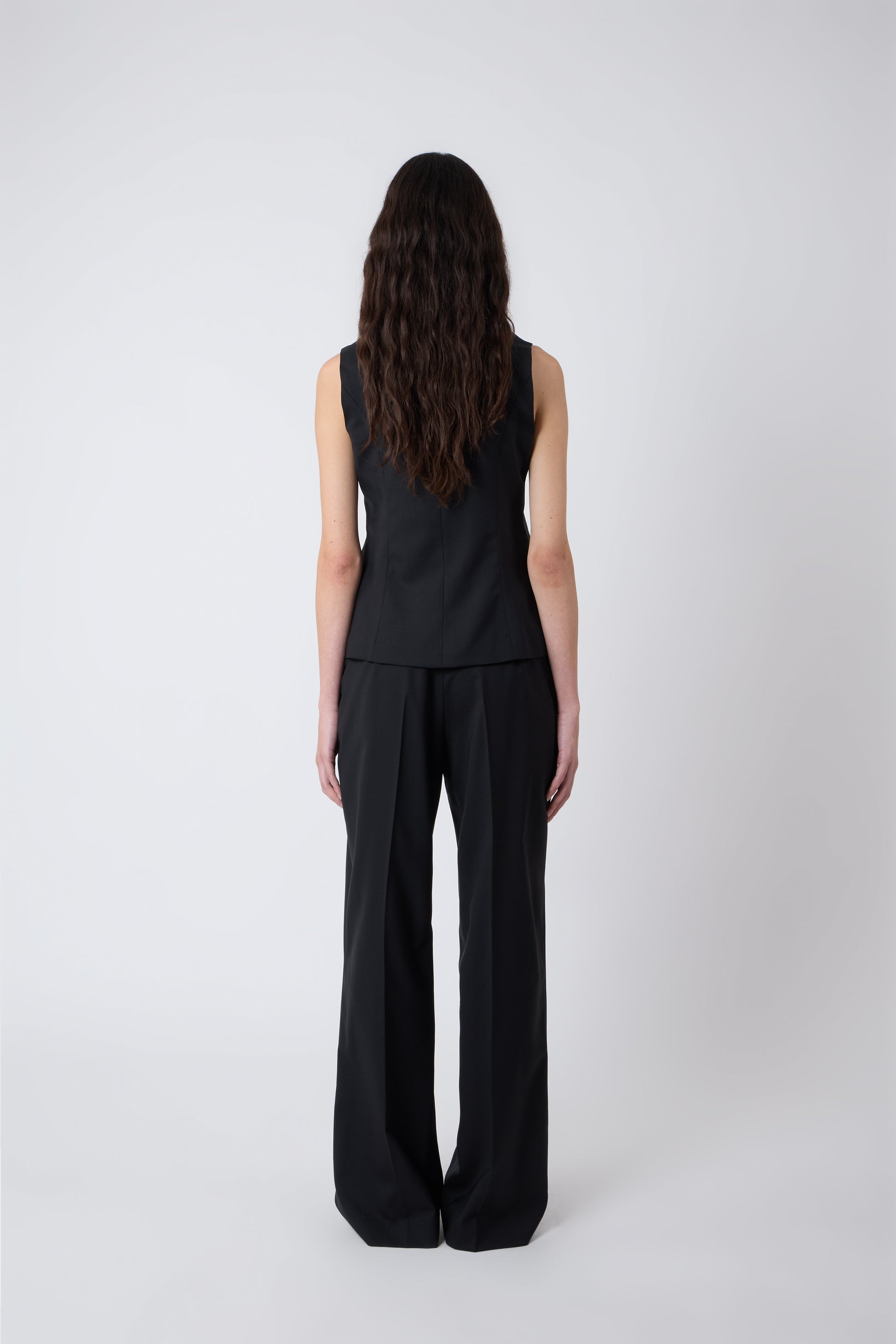 The Macondo vest, with its wrap-around fit and corset hooks, is crafted from deadstock cool wool. It features a sleeveless silhouette, a high V-neckline, and is completed with a row of piercing that open from the waist. This composition achieves a harmonious juxtaposition of femininity and a rebellious spirit.