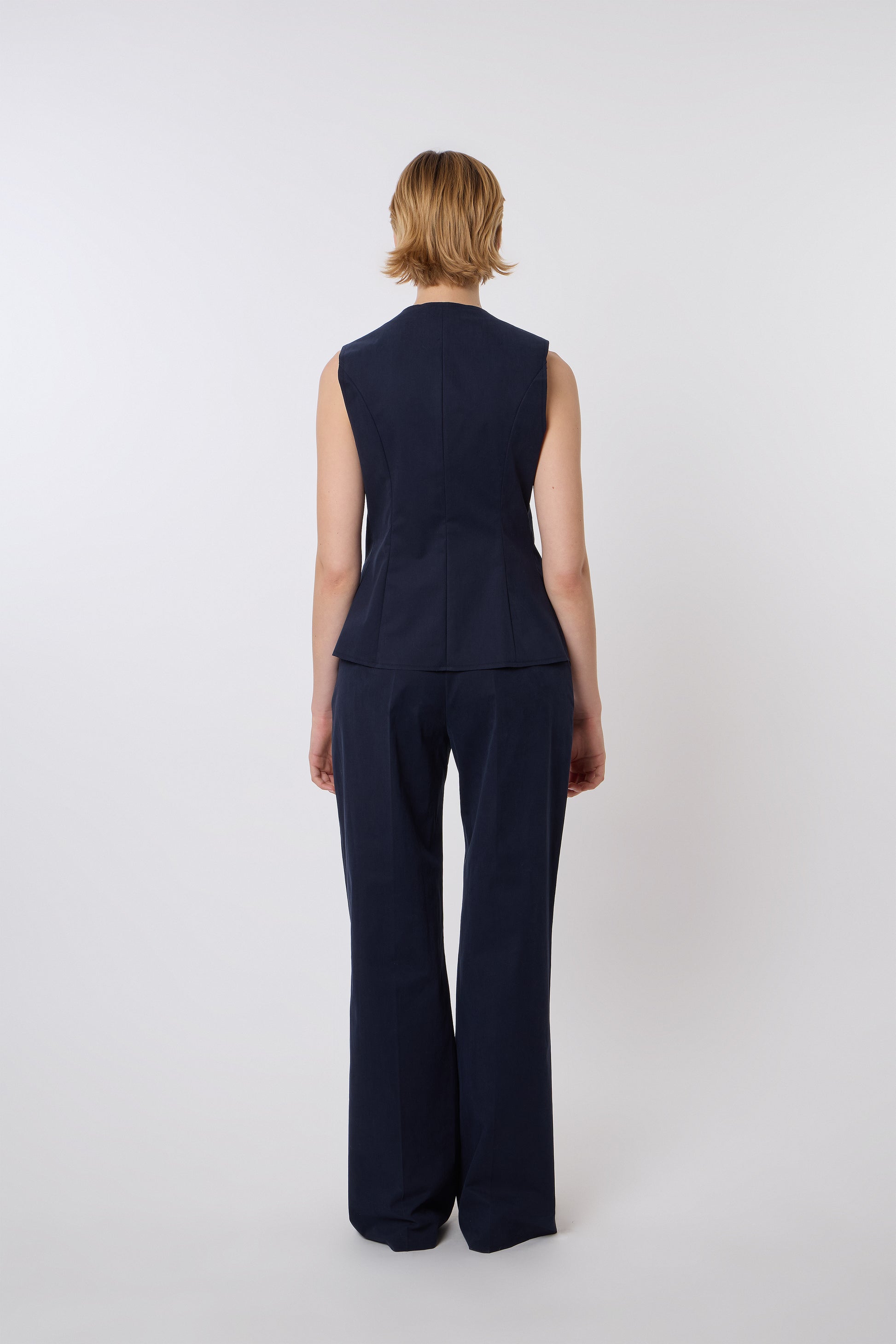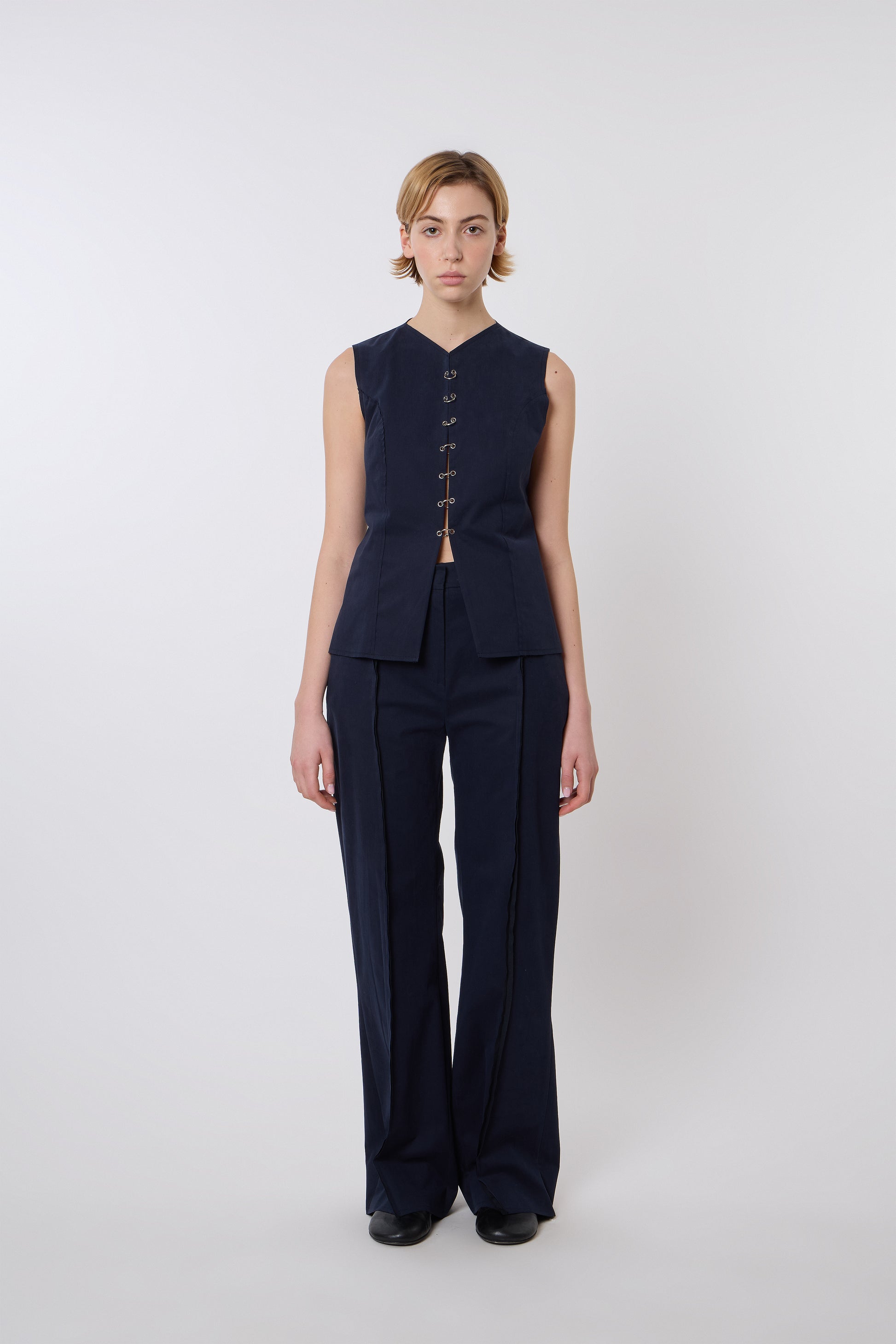 The Macondo vest, with its wrap-around fit and corset hooks, is crafted from deadstock cotton. It features a sleeveless silhouette, a high V-neckline, and is completed with a row of piercing that open from the waist. This composition achieves a harmonious juxtaposition of femininity and a rebellious spirit.