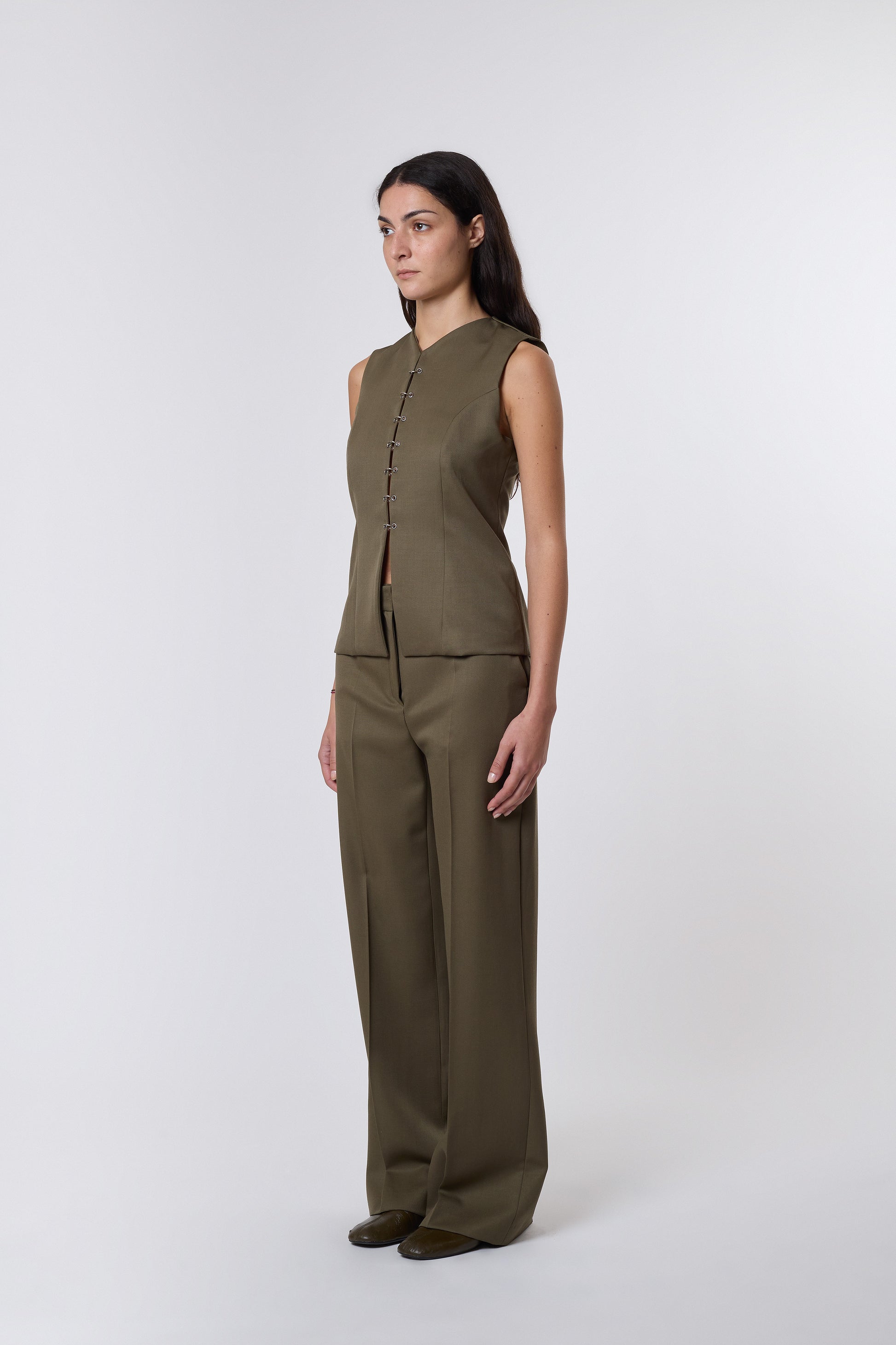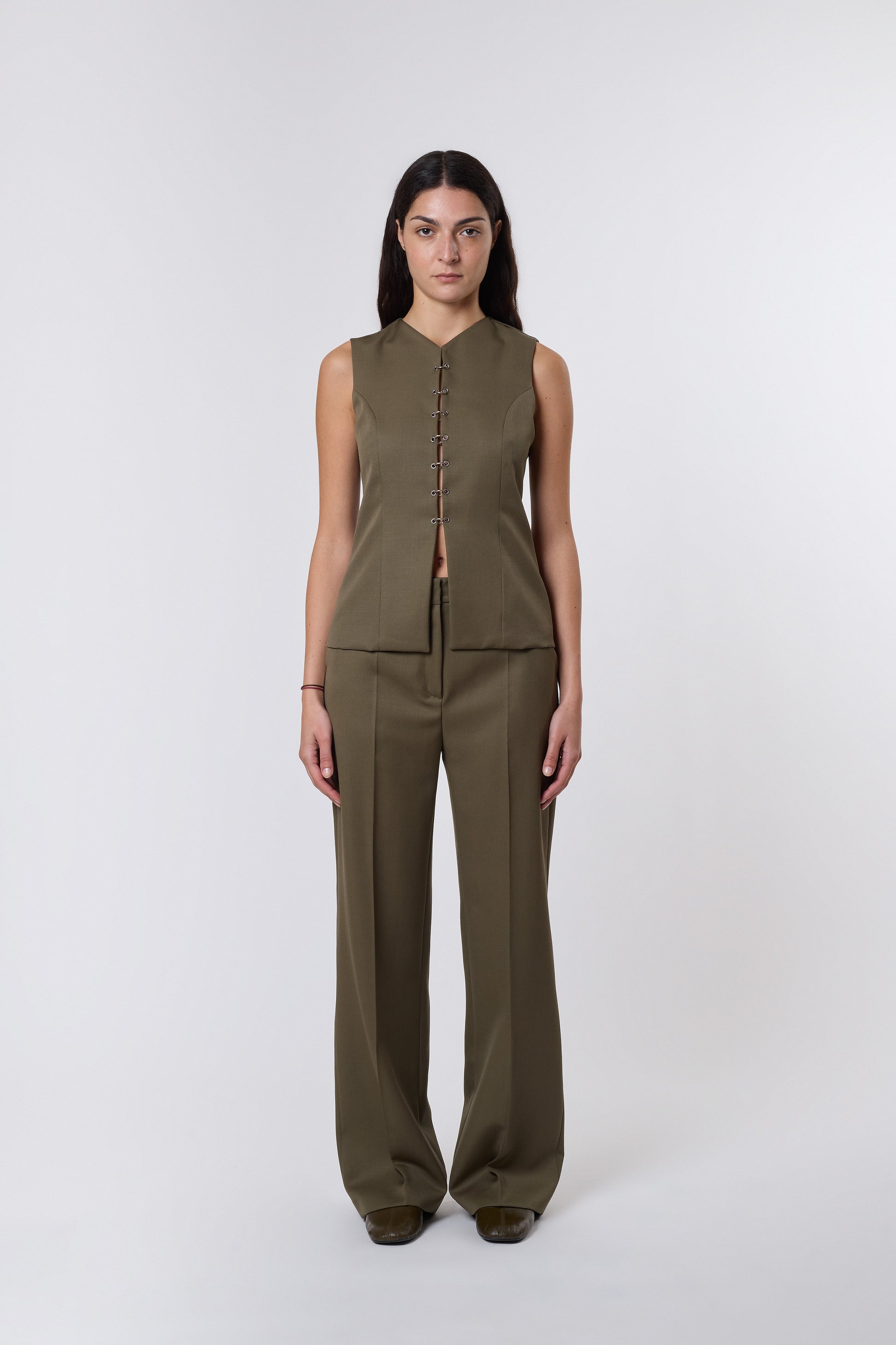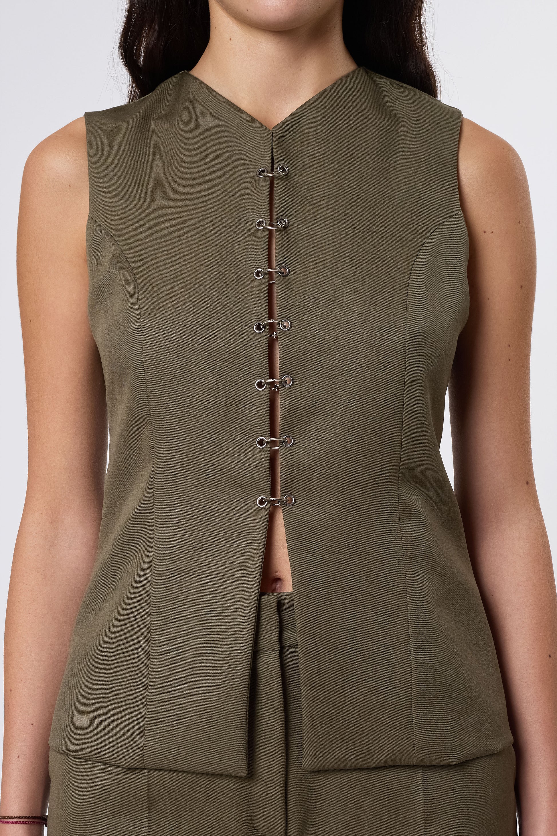 The Macondo vest, with its wrap-around fit and corset hooks, is crafted from deadstock cool wool. It features a sleeveless silhouette, a high V-neckline, and is completed with a row of piercing that open from the waist. This composition achieves a harmonious juxtaposition of femininity and a rebellious spirit.