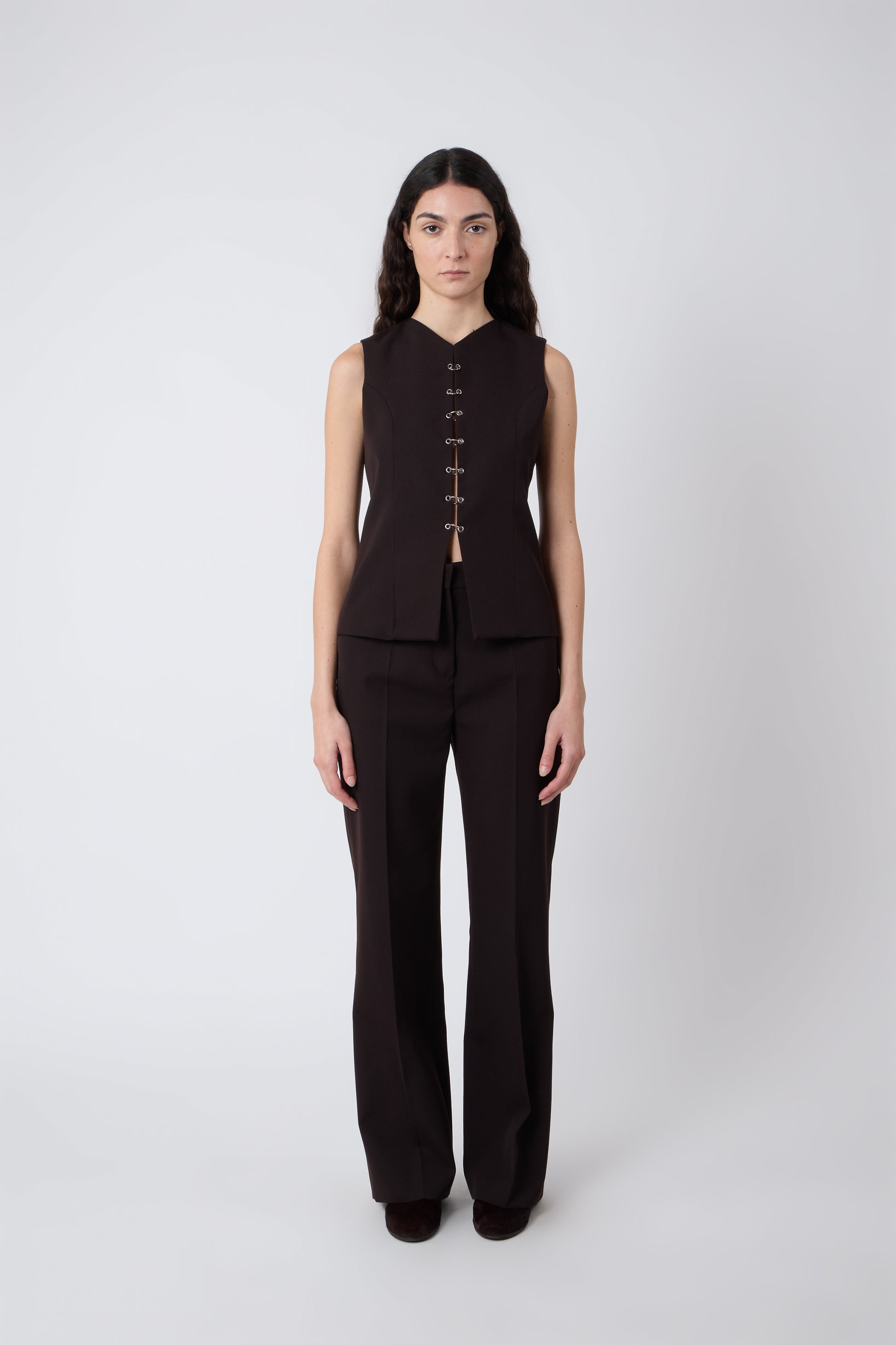 The Macondo vest, with its wrap-around fit and corset hooks, is crafted from deadstock wool. It features a sleeveless silhouette, a high V-neckline, and is completed with a row of piercing that open from the waist. This composition achieves a harmonious juxtaposition of femininity and a rebellious spirit.