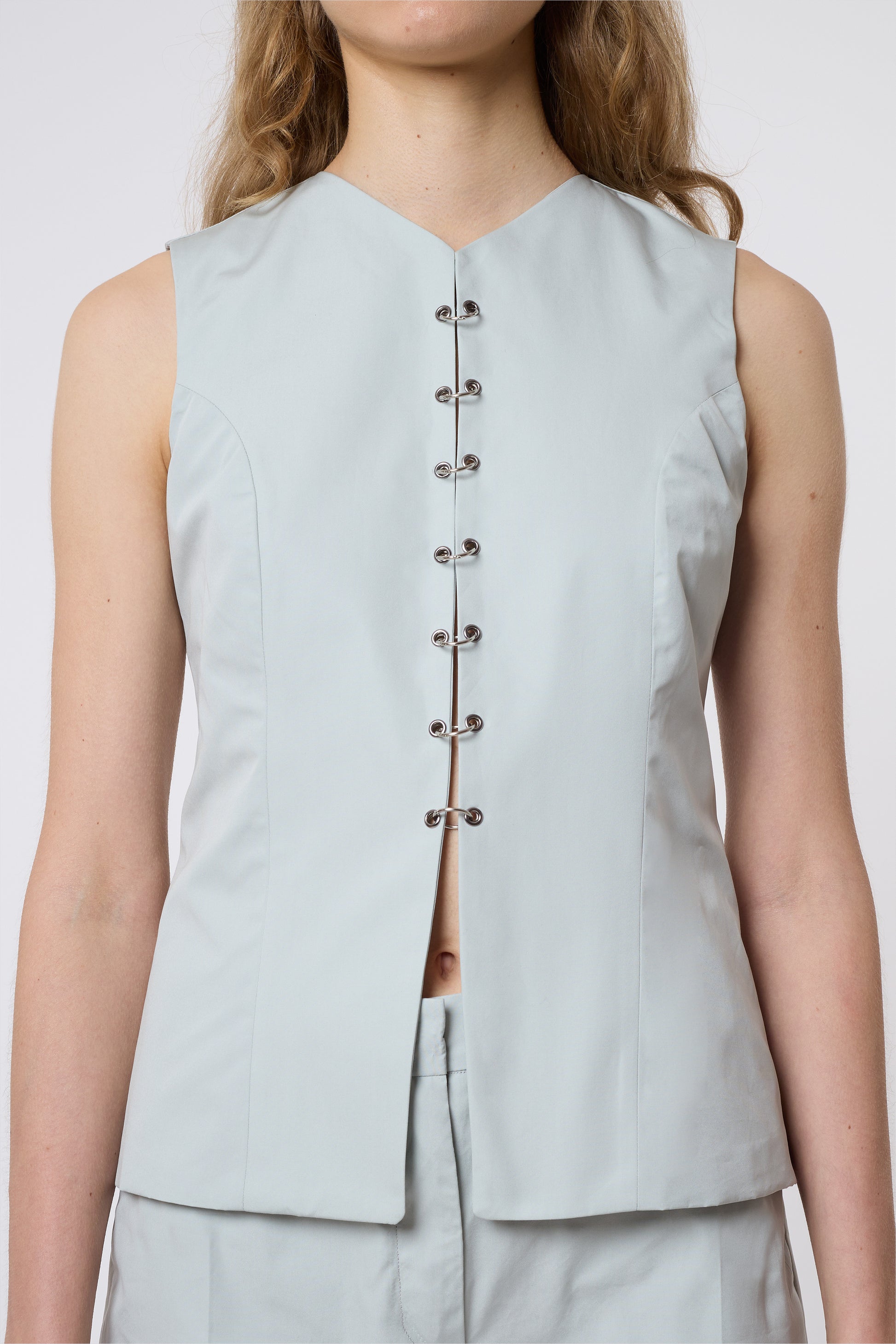 The Macondo vest, with its wrap-around fit and corset hooks, is crafted from deadstock cotton.. It features a sleeveless silhouette, a high V-neckline, and is completed with a row of piercing that open from the waist. This composition achieves a harmonious juxtaposition of femininity and a rebellious spirit.