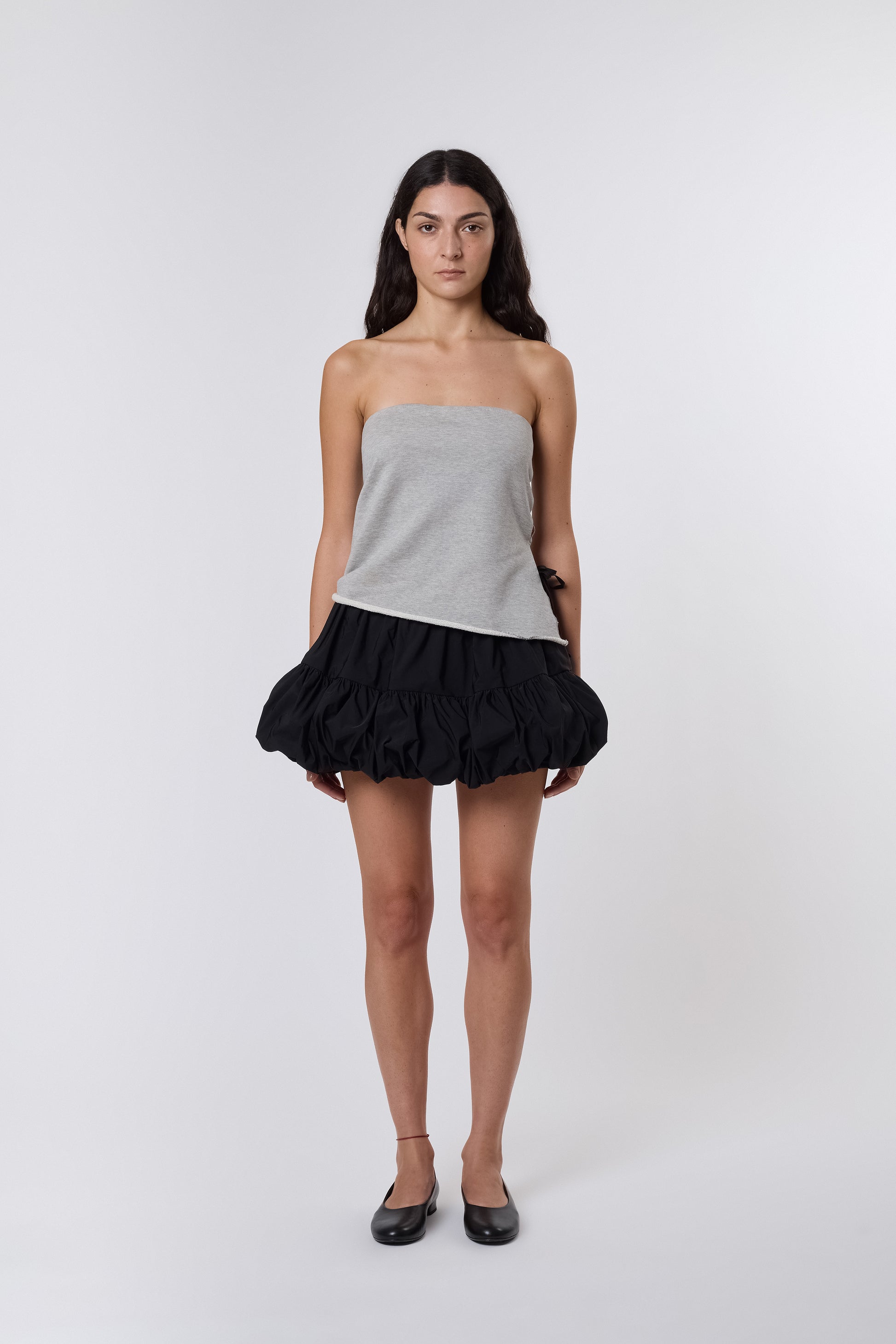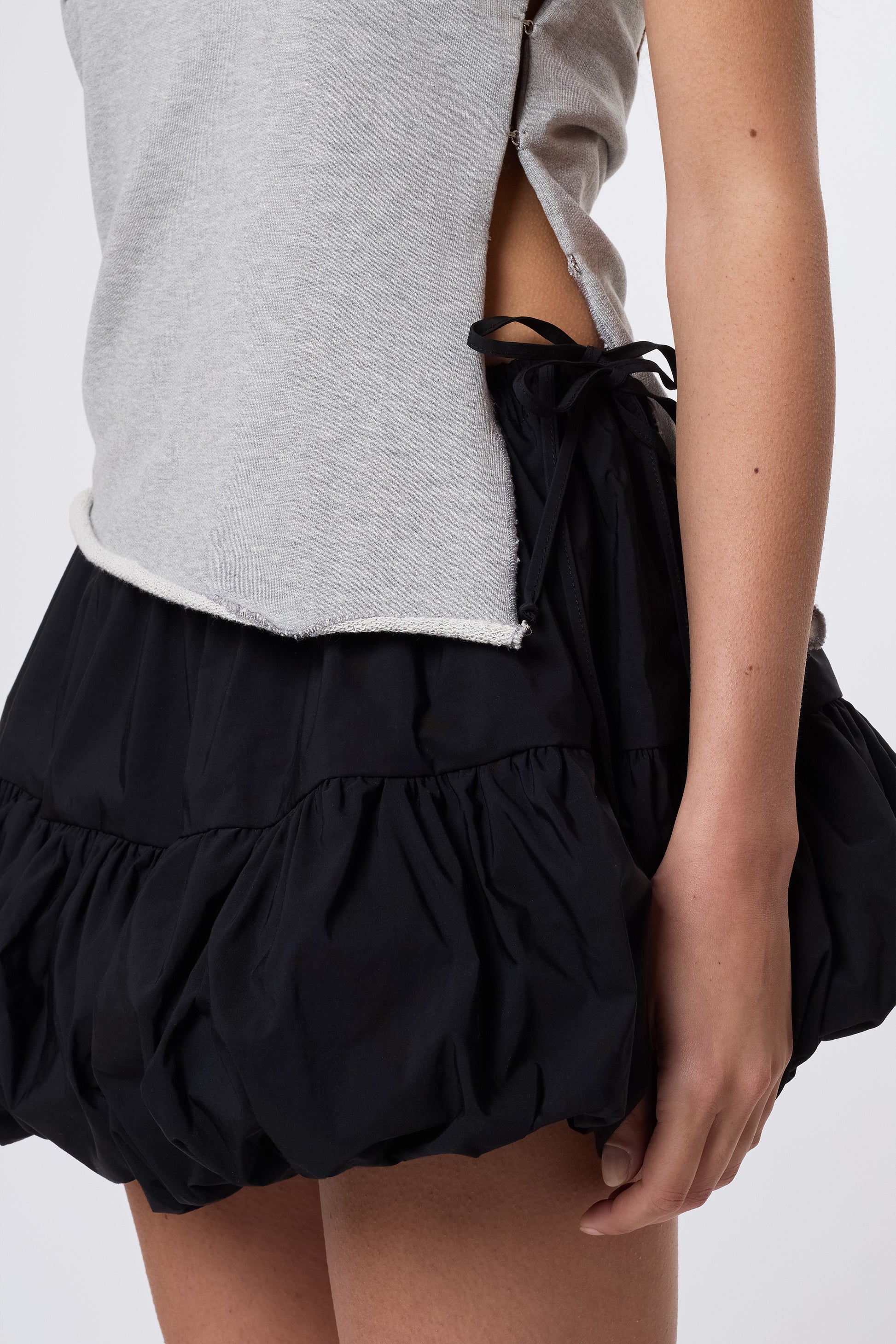 Our Miel is a balloon mini-skirt with a crisp flounce and an adjustable waist thanks to the two drawstrings. The skirt is cut from a precious deadstock nylon, carefully sourced in Bergamo. It is the perfect combination of sophisticated and everyday wear.