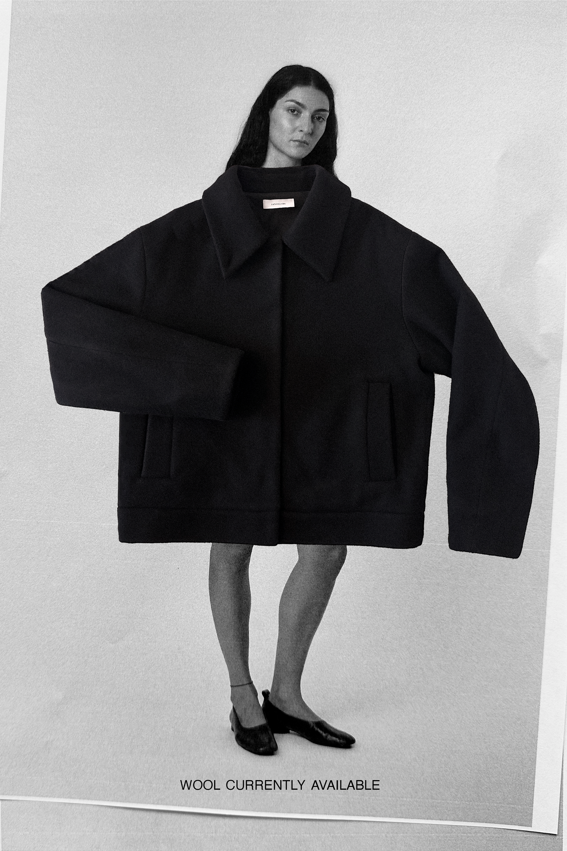 Its boxy silhouette sits on the hips, creating a bouncy effect. It features a pointed collar that can be worn down or closed with a hidden button.