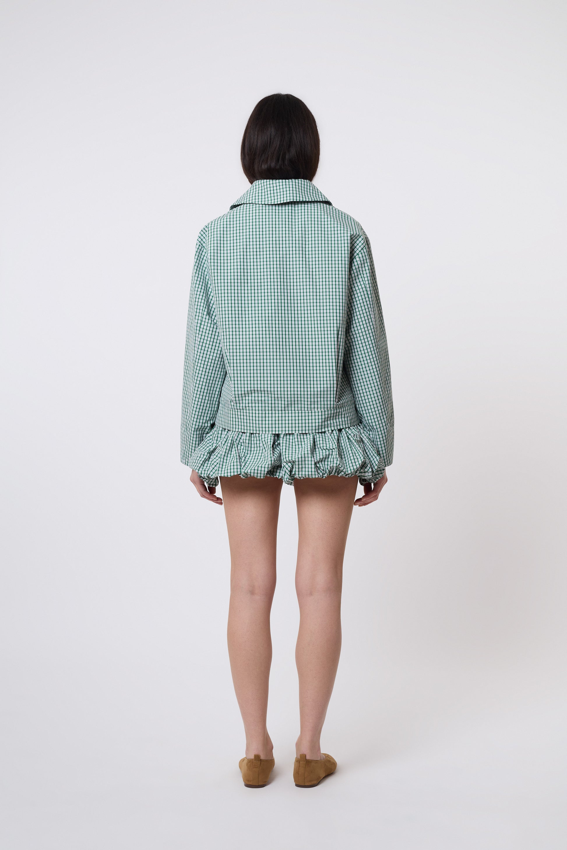 Its boxy silhouette sits on the hips, creating a bouncy effect. It features a pointed collar that can be worn down or closed with a hidden button.