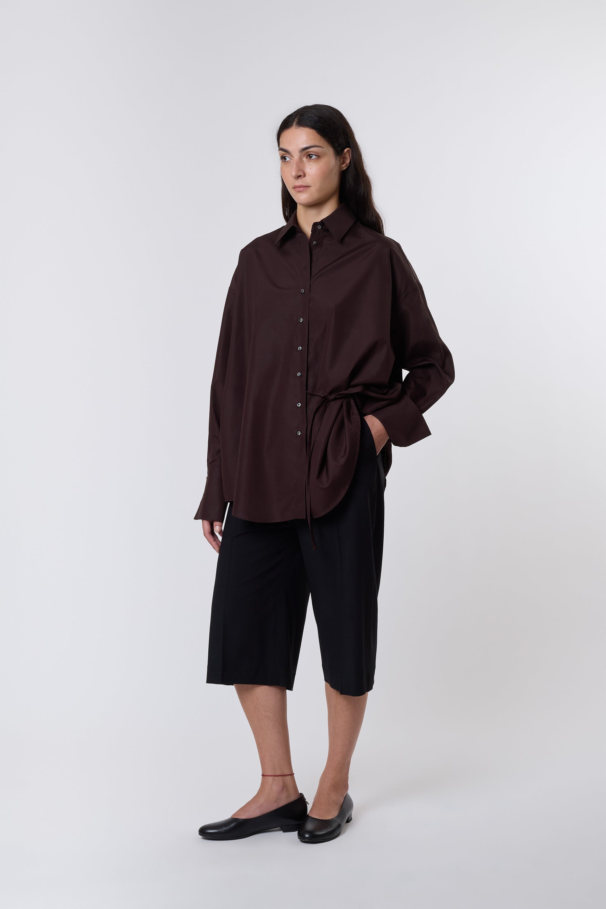 It has a low waisted silhouette and a wide leg. Details such as a cotton inner band, front zipper closure, side pockets, belt loops and invisible hem embody the values of Italian savoir faire.